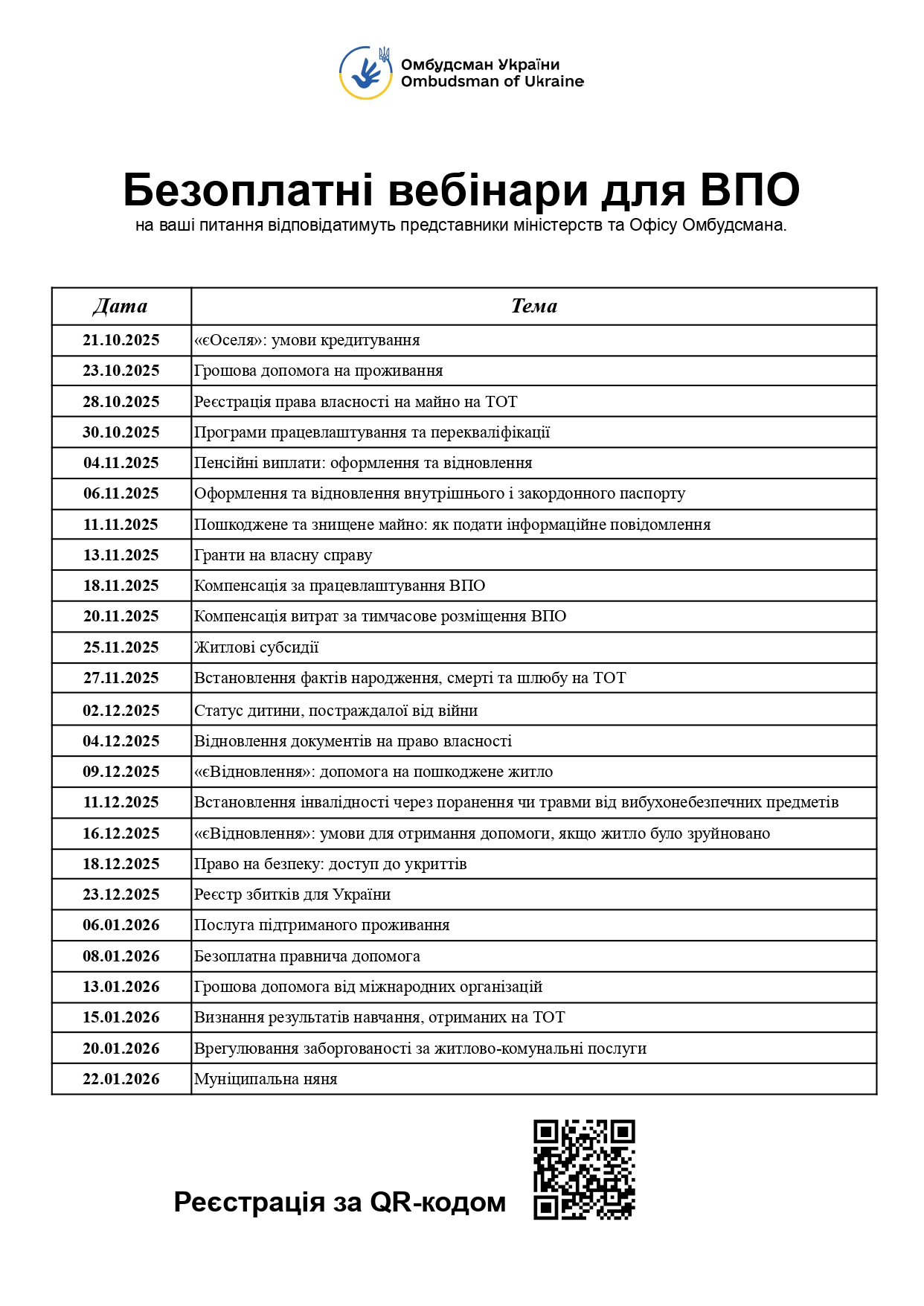 Безоплатні вебінари для ВПО 13 Жовтня 2025 | Інформація для ВПО на ваші питання відповідатимуть представники міністерств та Офісу Омбудсмана Опубліковано в Інформація для ВПО Більше з Інформація для ВПОБільше записів у Інформація для ВПО »Програма для ВПО – “Єднання заради дії”Програма для ВПО – “Єднання заради дії”У Тернополі проведуть «Ярмарок можливостей» для ВПО та тих, хто у пошуку роботиУ Тернополі проведуть «Ярмарок можливостей» для ВПО та тих, хто у пошуку роботи