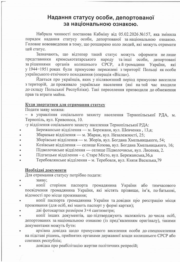 Надання статусу особи, депортованої за національною ознакою 27 Квітня 2026 | ГОЛОВНА Надання статусу особи, депортованої за національною ознакою Опубліковано в ГОЛОВНА Більше з ГОЛОВНАБільше записів у ГОЛОВНА »Філія “Подільський лісовий офіс” ДП “Ліси України” (58009, м.Чернівці, вул. Руська, 203А) інформує про можливість здійснення реалізації паливної деревиниФілія “Подільський лісовий офіс” ДП “Ліси України” (58009, м.Чернівці, вул. Руська, 203А) інформує про можливість здійснення реалізації паливної деревиниОздоровлення та відпочинку для дітей, які потребують особливої соціальної уваги і підтримкиОздоровлення та відпочинку для дітей, які потребують особливої соціальної уваги і підтримки