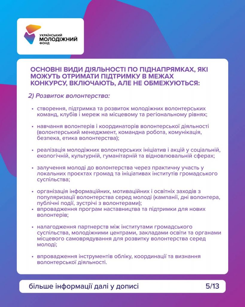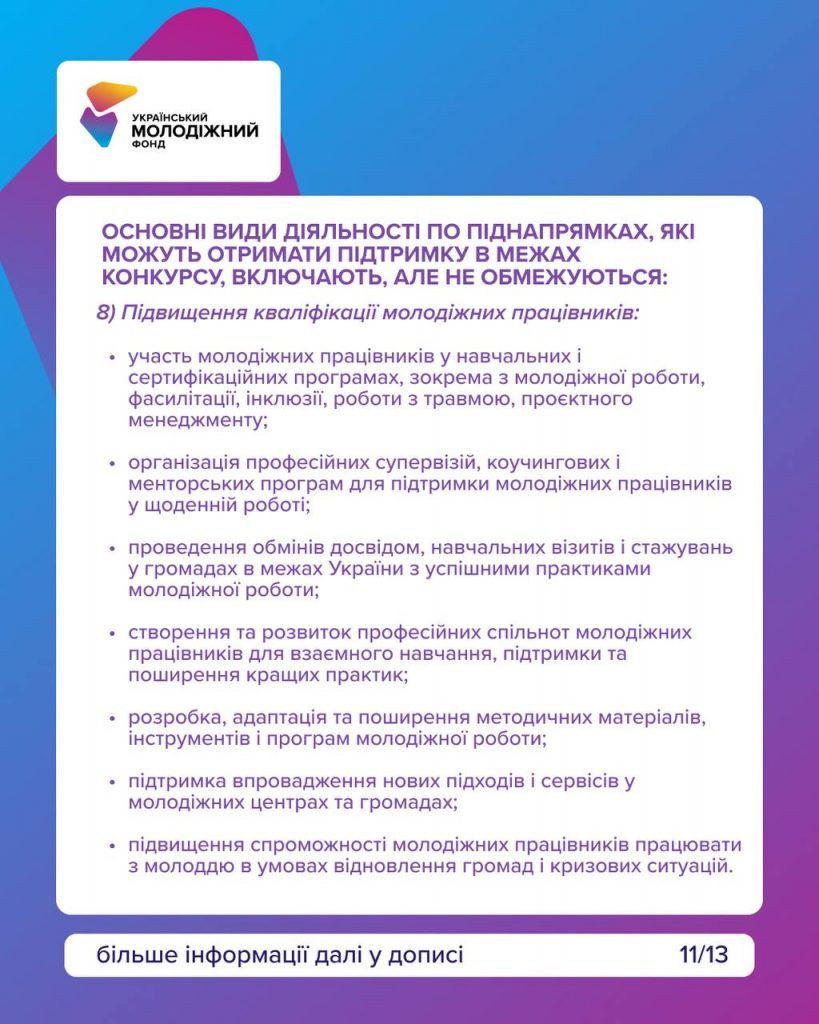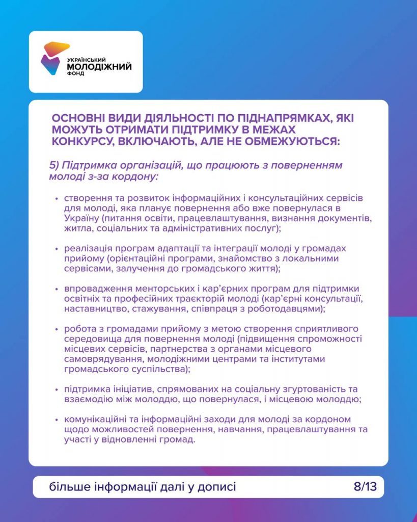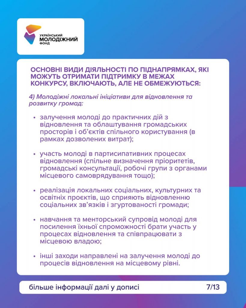 Цей конкурс для команд, які працюють із молоддю та реалізовують ініціативи у сфері освіти, волонтерства, розвитку громад, мобільної роботи чи підтримки молоді, що повертається в Україну.