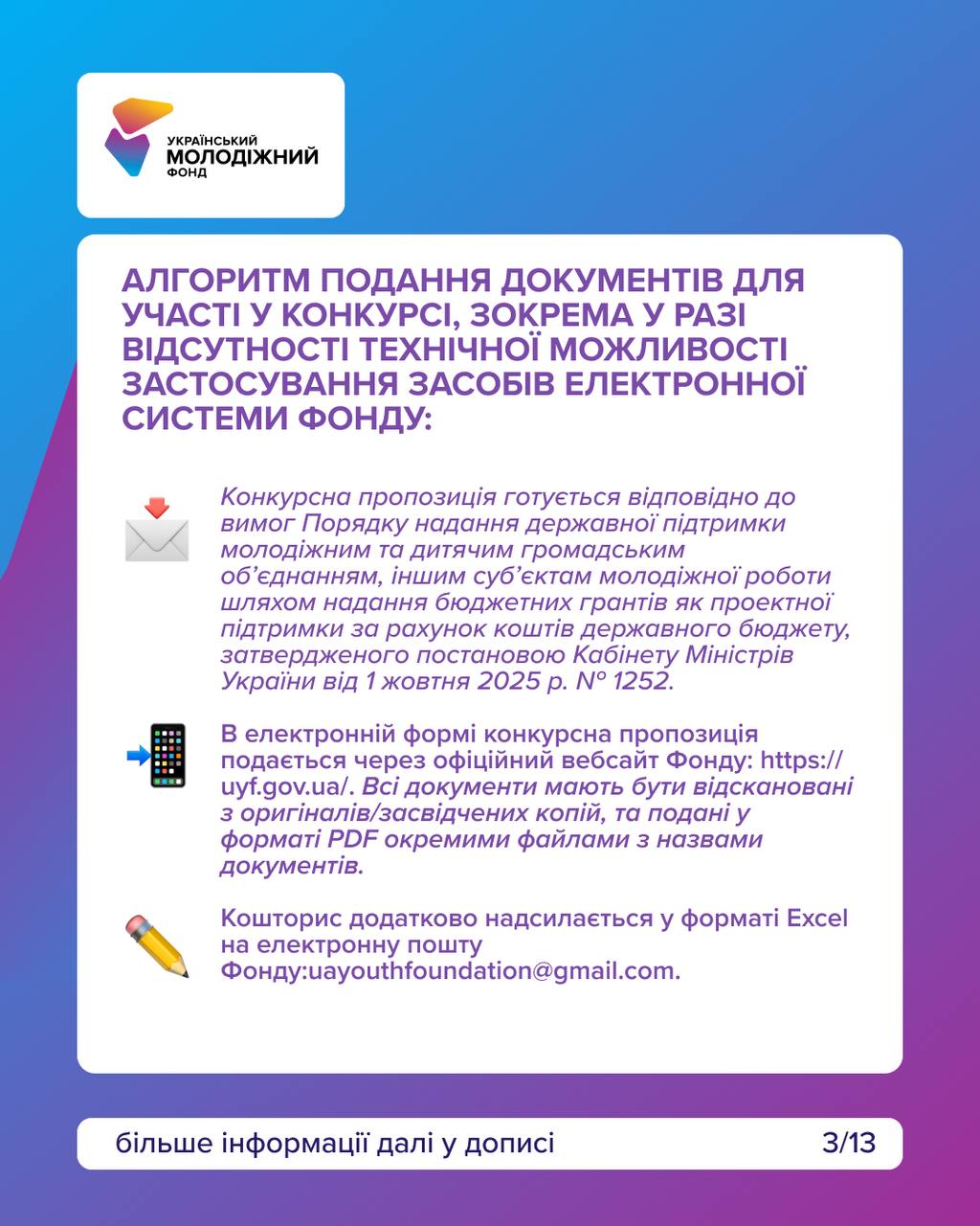Документи необхідні у форматі PDF, а кошторис у форматі Excel на uayouthfoundation@gmail.com.
